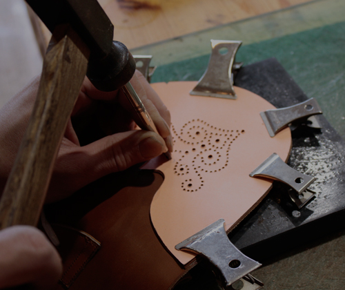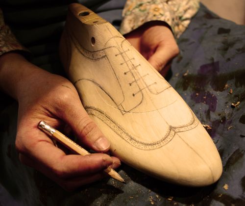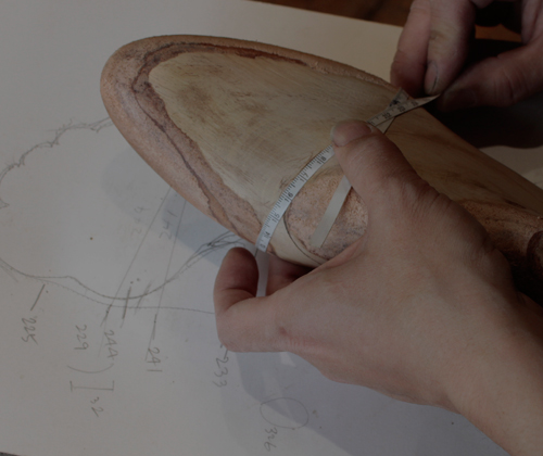 その木型にお好きなデザインを描き、デザインに合った革や底材、